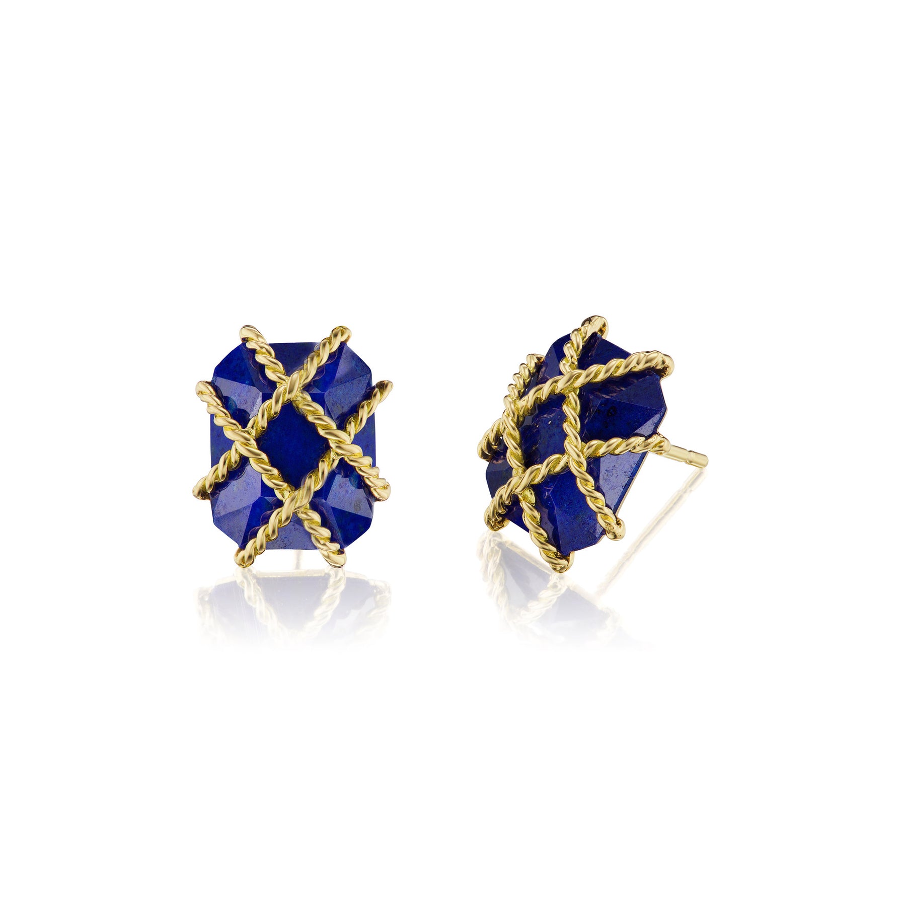 The Petronia Collection features emerald cut, meticulously selected stones encased in twisted gold wire. Original inspiration can be traced back to the Tudor-style leaded glass latticed windows of the 15th century. The Petronia Earrings with their bold architectural lines and dimensionality make it an eye-catching statement piece. Oversized earring backs featuring a unique additional stabilizing jump ring are provided with every pair. This distinctive design element is significant for providing the ideal on-ear coverage and fit.