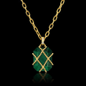 Regular price $2,500.00The Petronia Collection features emerald cut, meticulously selected stones encased in twisted gold wire. Original inspiration can be traced back to the Tudor-style leaded glass latticed windows of the 15th century. The Petronia Pendant with its bold architectural lines and dimensionality carries through the Tudor theme and design sensibilities seen throughout many of the TW Kessler collections. In these pieces, the caged stone’s beauty is only elevated by its bodice of interlaced gold wire, evocative of a sailor’s rope. Even the smallest design elements are never overlooked. The bail, which connects the pendant to the chain, features six diamonds for a discreet hint of sparkle.