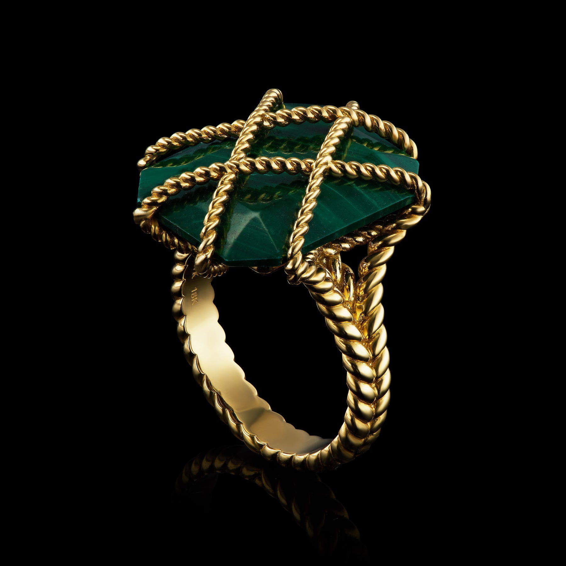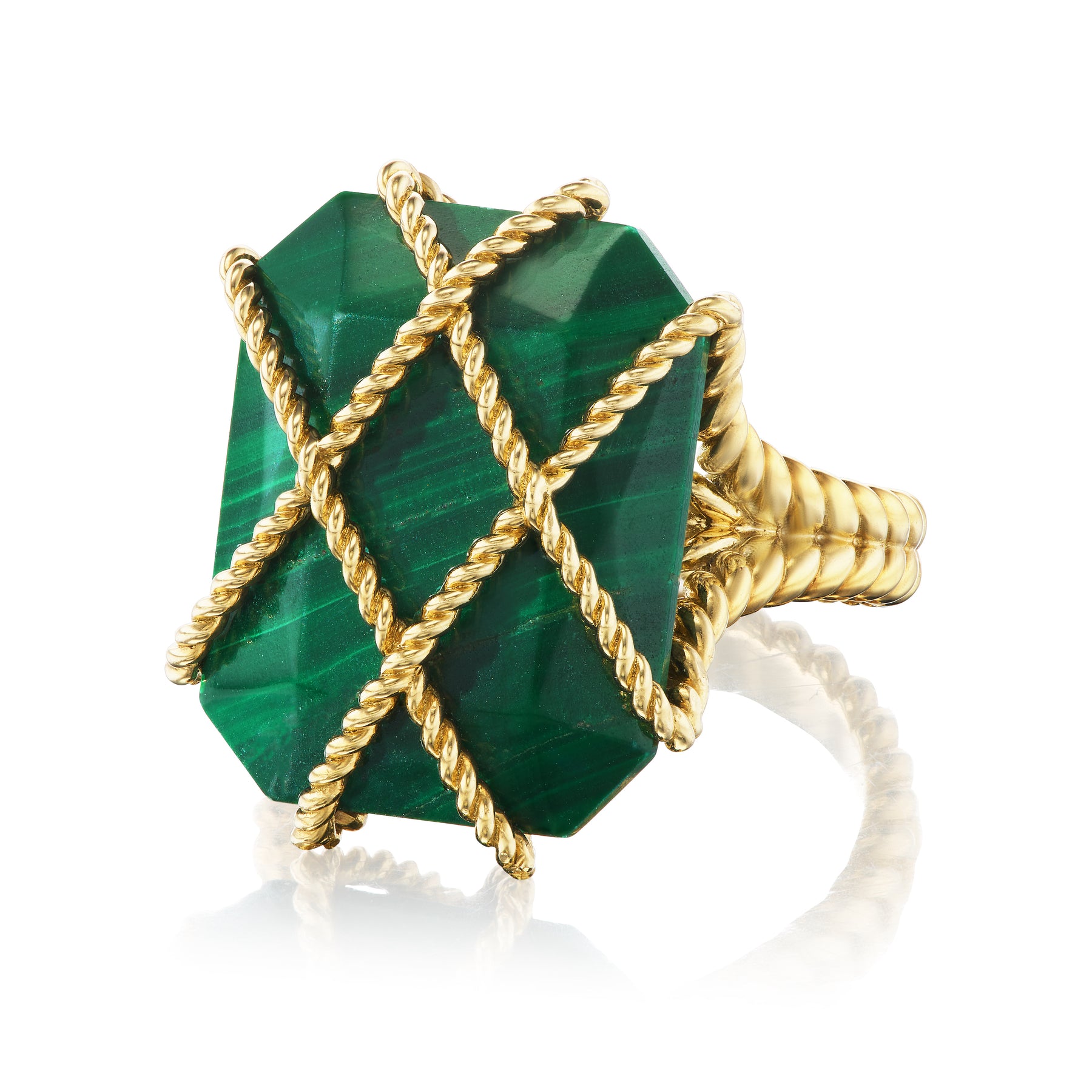 The Petronia Collection features emerald cut, meticulously selected stones encased in twisted gold wire. Original inspiration can be traced back to the Tudor-style leaded glass latticed windows of the 15th century. The Petronia Ring with its bold architectural lines and dimensionality carries through the Tudor theme and design sensibilities seen throughout many of the TW Kessler collections. In these pieces, the caged stone’s beauty is only elevated by its bodice of interlaced gold wire, evocative of a sailor’s rope. Even the smallest design elements are never overlooked. This magnificent cocktail ring has all the grandeur and presence of a turret aloft a stately British manor house.