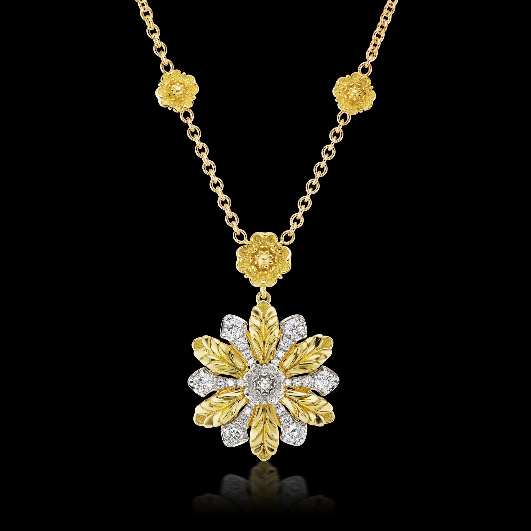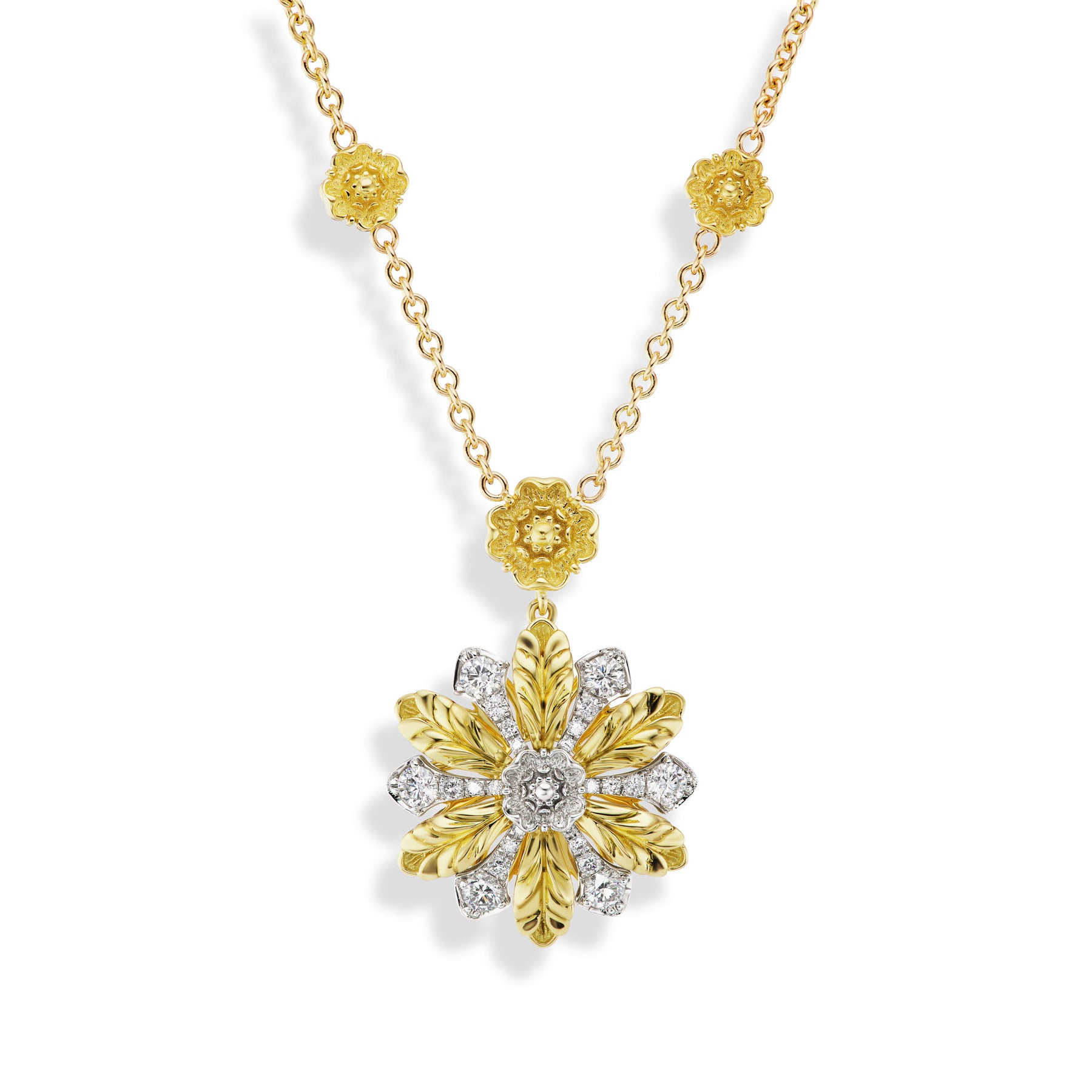 This perfectly proportioned pendant is a stunning statement piece for a special occasion, but is versatile enough for daily wear. The six acanthus leaves, handcrafted from 18k yellow gold, are interspersed with platinum and diamond fronds radiating from a delicate floret center. The floret theme is continued with the motifs on the delicate gold chain.